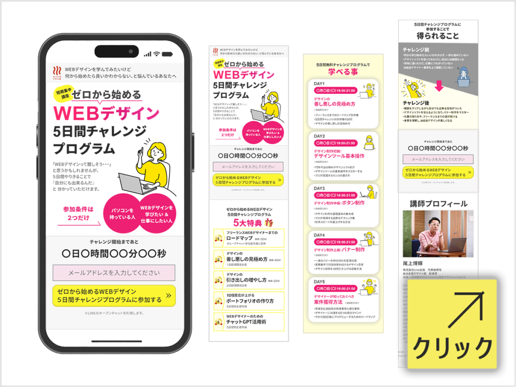 商品の魅力やサービスの強みを整理し、ユーザーが行動したくなる導線設計を意識したランディングページを制作します。